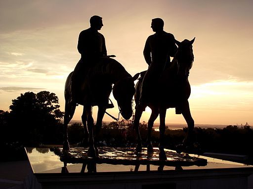 Statue of Joseph and Hyrum Smith on their way from Nauvoo, Illinois to the Carthage Jail. Located in front of the Nauvoo Illinois Temple. This 2003 sculpture is by Stanley J. Watts (human figures) and Kim Corpany (horses).